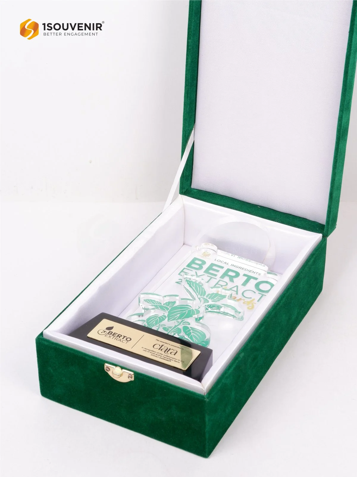 Plakat Berto Extract Award diberikan kepada Ciara sebagai bentuk penghargaan atas kontribusinya dalam kolaborasi penggunaan bahan aktif lokal. Desainnya yang modern dengan elemen visual tanaman memberikan kesan segar, sekaligus merepresentasikan nilai alami yang diusung.