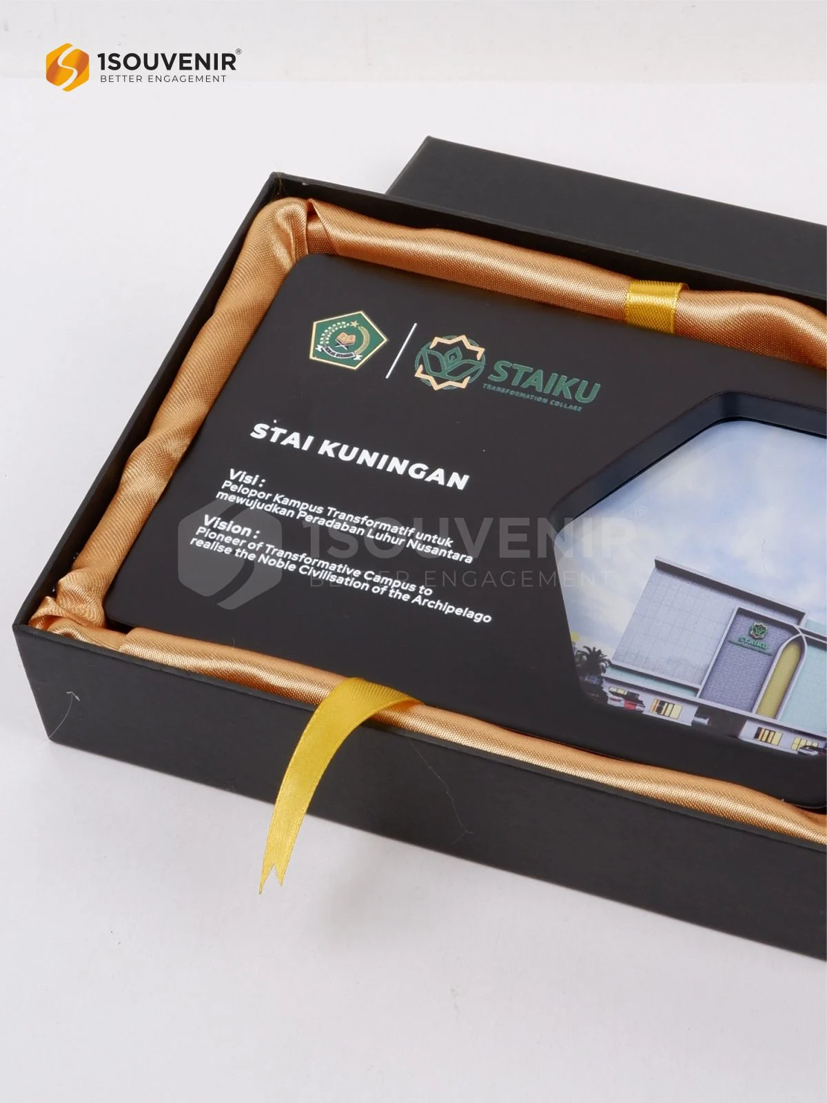 Plakat STAI Kuningan ini menjadi kenang-kenangan yang menyimpan cerita institusi: logo, identitas, serta visual bangunan sebagai penanda mimpi yang sedang diwujudkan. Bukan hanya pajangan, tetapi pengingat arah dan kebersamaan. Plakat kayu akrilik ini mampu menyampaikan nilai perguruan tinggi dengan baik.