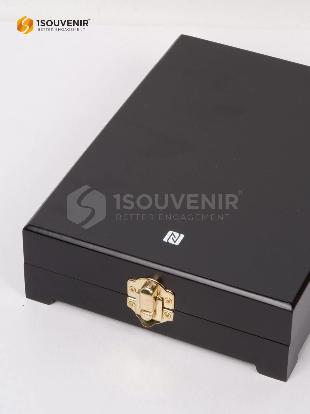 | Teknik | logo bea cukai kuningan etsa cat poles, materi kuningan etsa cat, NFC pada tutup box kayu |