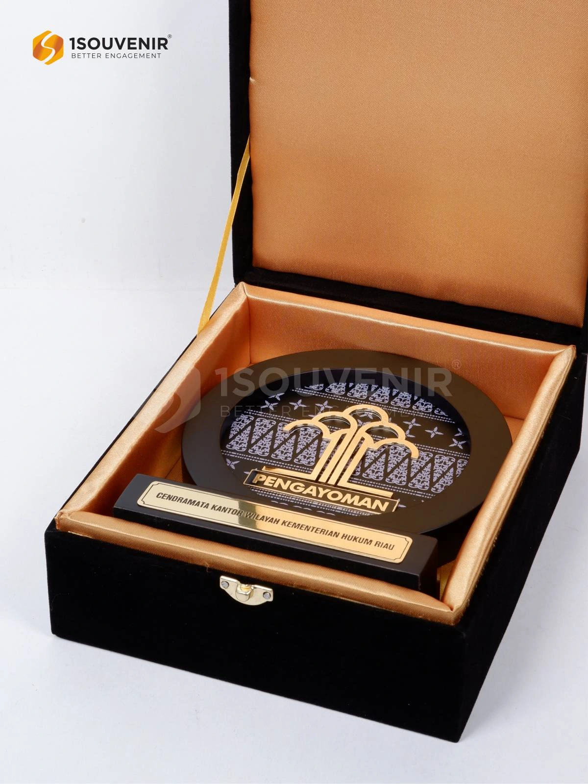 Plakat Kanwil Kemenkumham Riau dihadirkan sebagai kenang-kenangan yang merepresentasikan identitas institusi sekaligus simbol apresiasi dalam setiap momen penting. Desainnya menampilkan elemen khas Pengayoman dengan sentuhan elegan, menjadikannya cendera mata yang bermakna bagi tamu kehormatan maupun mitra kerja.