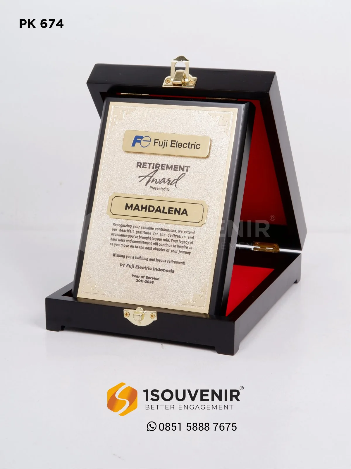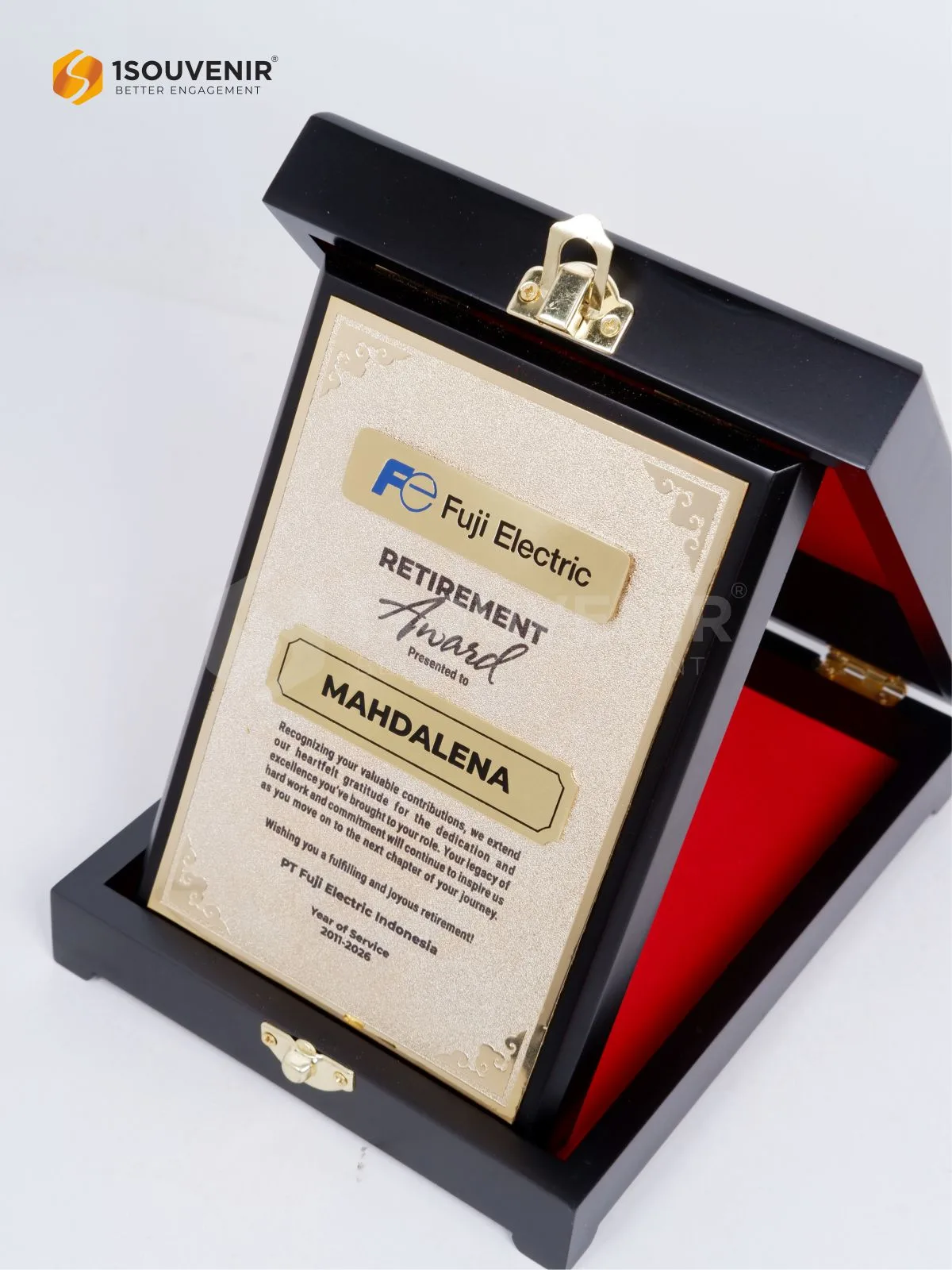 Plakat Fuji Electric Indonesia ini menjadi simbol penghargaan istimewa bagi karyawan purna tugas. Dirancang elegan dalam kotak eksklusif dengan sentuhan warna emas, plakat ini merepresentasikan rasa terima kasih atas dedikasi, kerja keras, dan perjalanan panjang yang penuh makna.