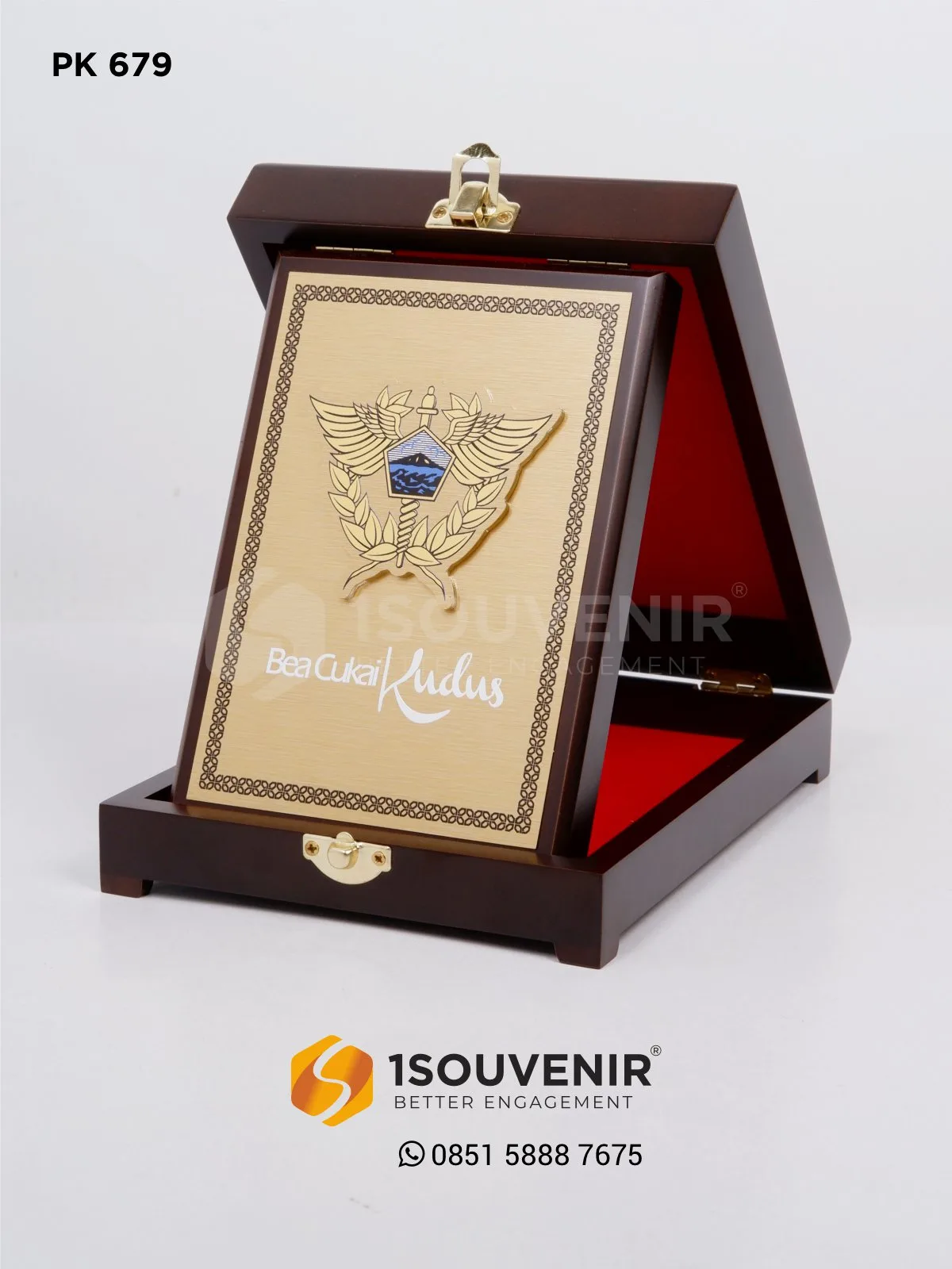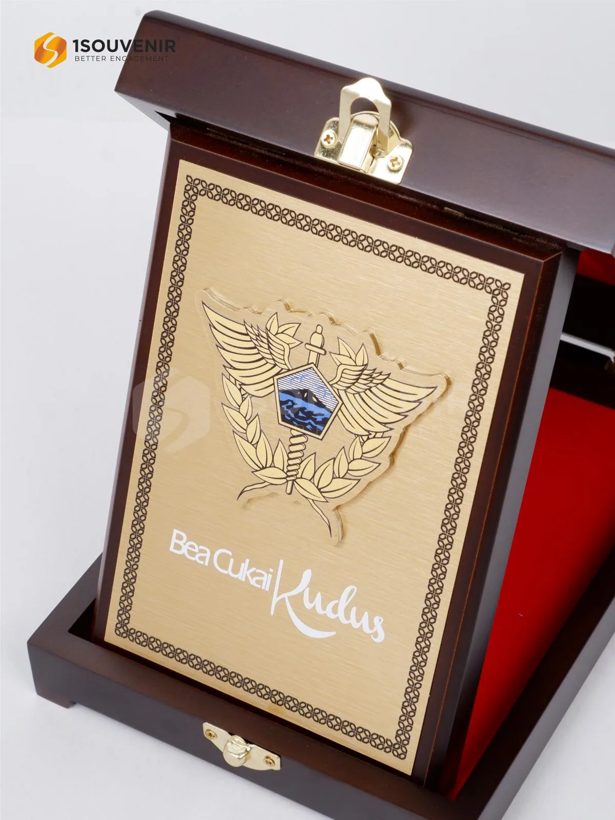 Plakat Bea Cukai Kudus ini menjadi bentuk cendera mata yang sarat makna. Dikemas dalam kotak elegan dengan pelat emas dan detail lambang resmi, plakat ini merepresentasikan kehormatan, apresiasi, serta identitas institusi yang kuat.