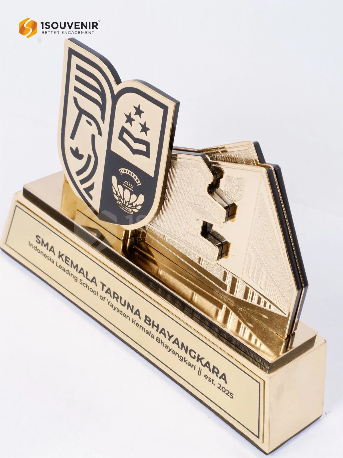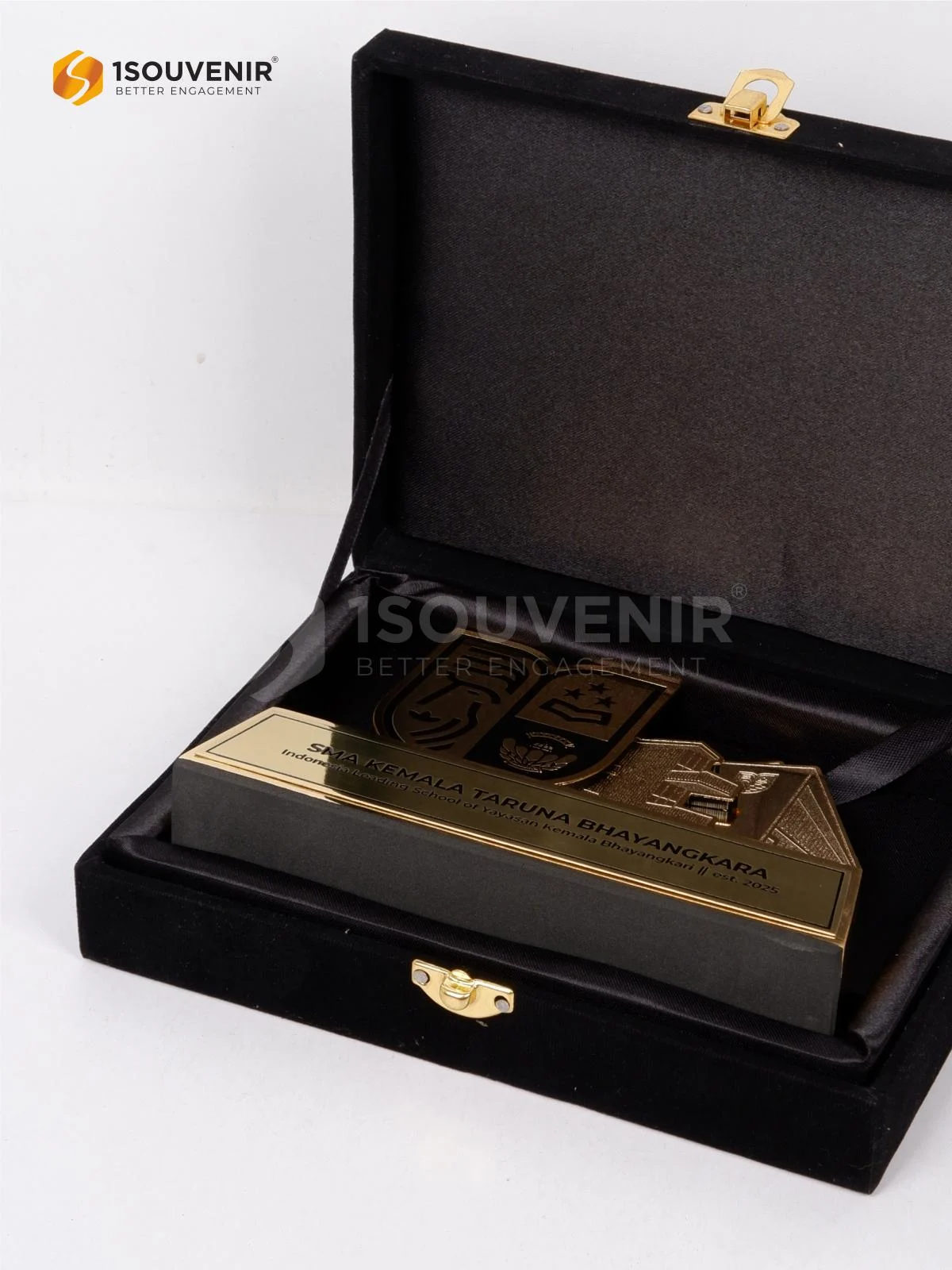 Semangat tersebut diabadikan dalam plakat SMA Kemala Taruna Bhayangkara elegan ini, menampilkan identitas sekolah dan bentuk gedung sebagai simbol kebanggaan, cocok menjadi cendera mata untuk kunjungan, penghargaan, atau kenangan resmi.