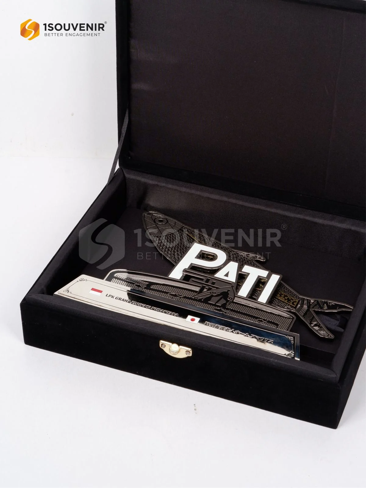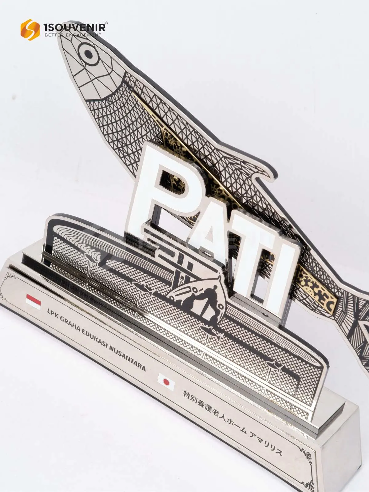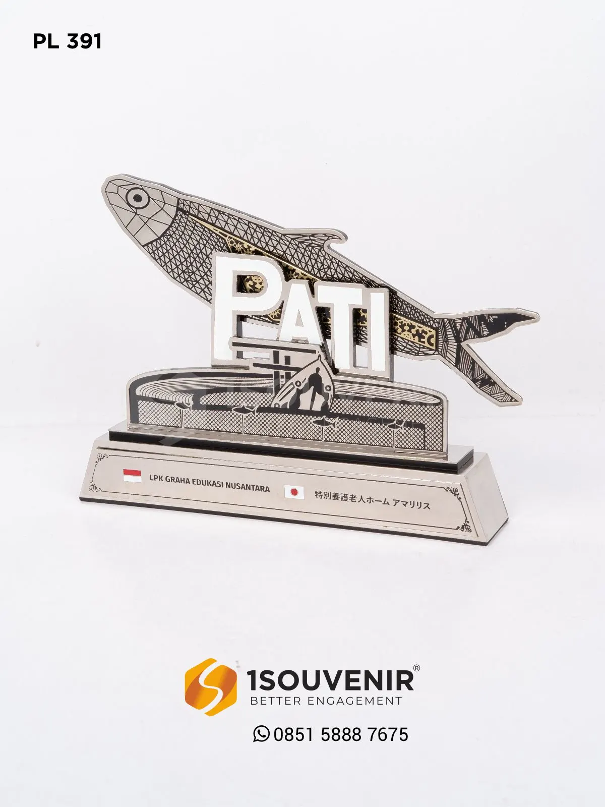 Plakat LPK Graha Edukasi Nusantara ini dirancang sebagai kenang-kenangan istimewa dengan sentuhan ikonik tugu bandeng khas Pati. Detail logam yang presisi dipadukan desain unik menciptakan kesan eksklusif, sekaligus merepresentasikan identitas daerah yang kuat.