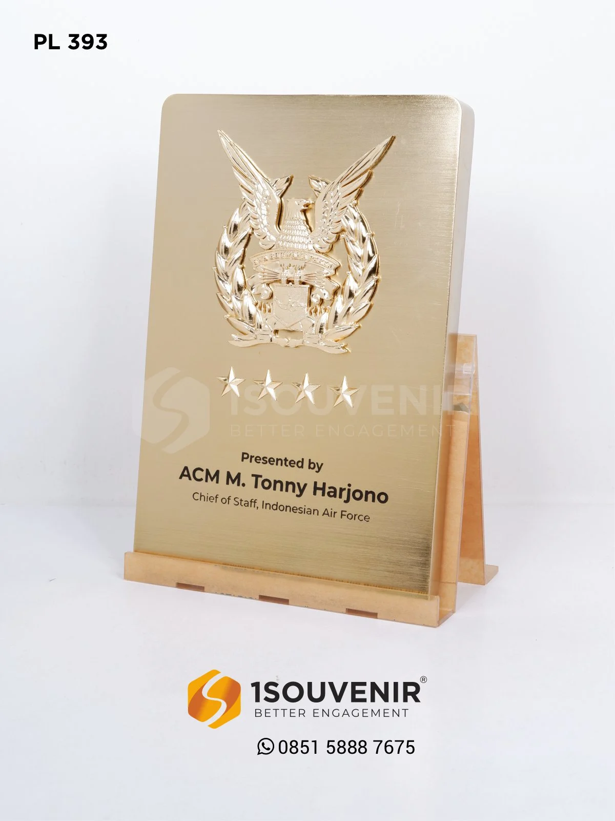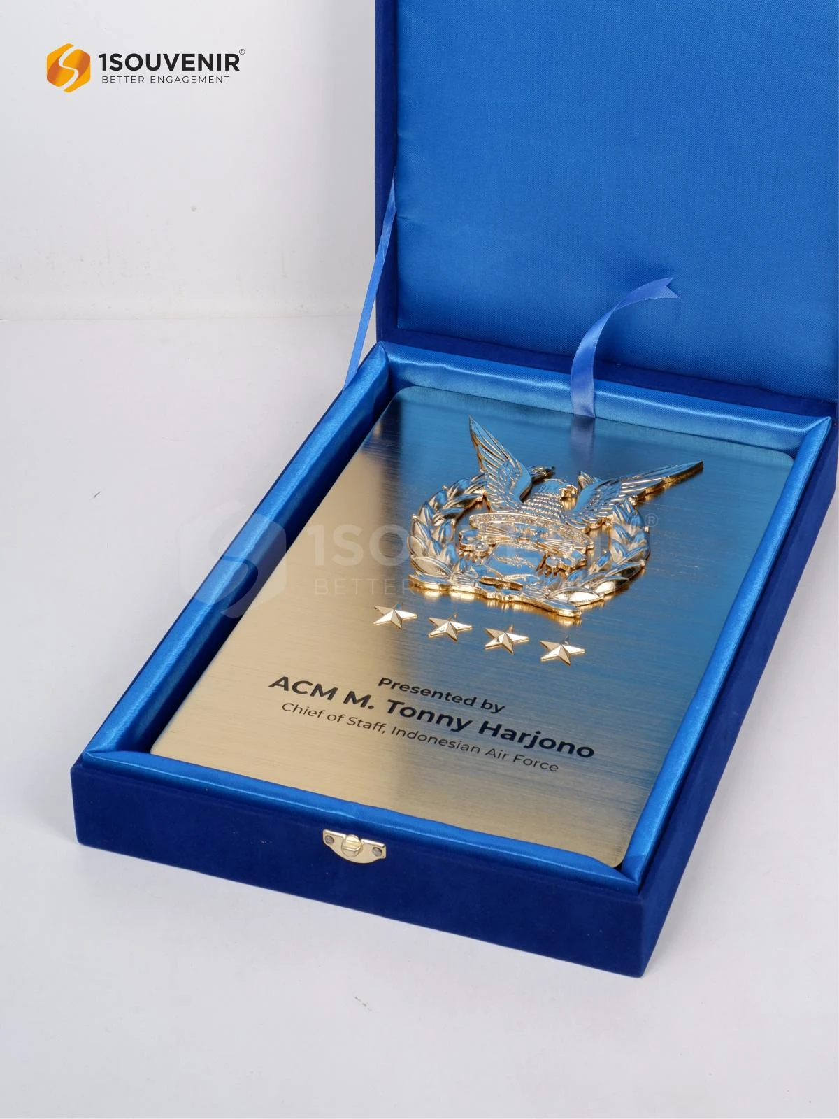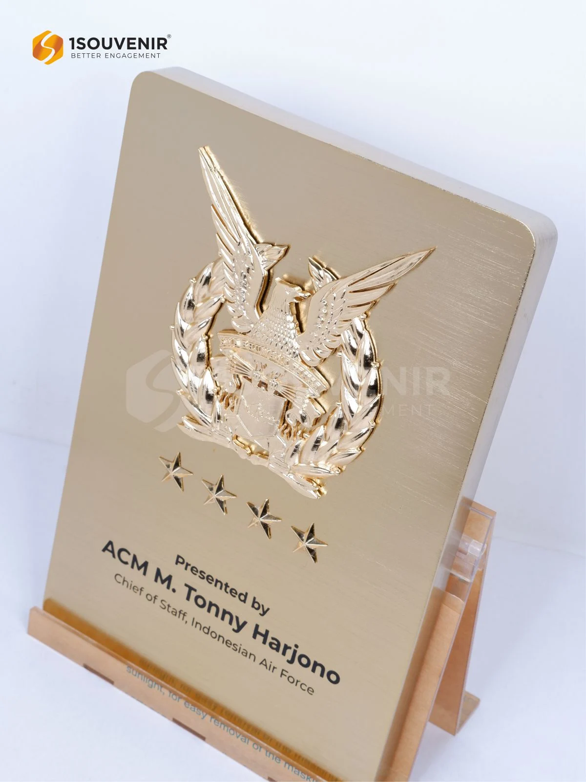Plakat Kepala Angkatan Udara Indonesia dihadirkan sebagai bentuk kenang-kenangan yang sarat makna. Detail logam berlapis emas dengan ukiran lambang dan bintang menciptakan kesan gagah, sekaligus merepresentasikan nilai kehormatan dan pengabdian.