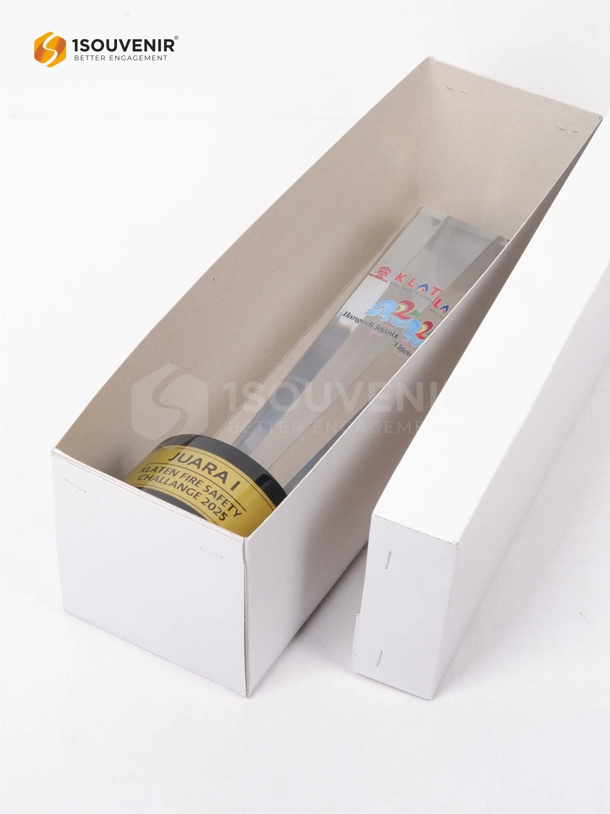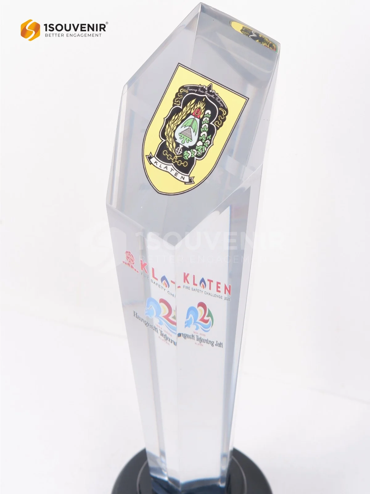 | Teknik | akrilik cutting print UV logo daerah dan logo acara cor resin, materi transparansi print gold cat silver cor resin dudukan |