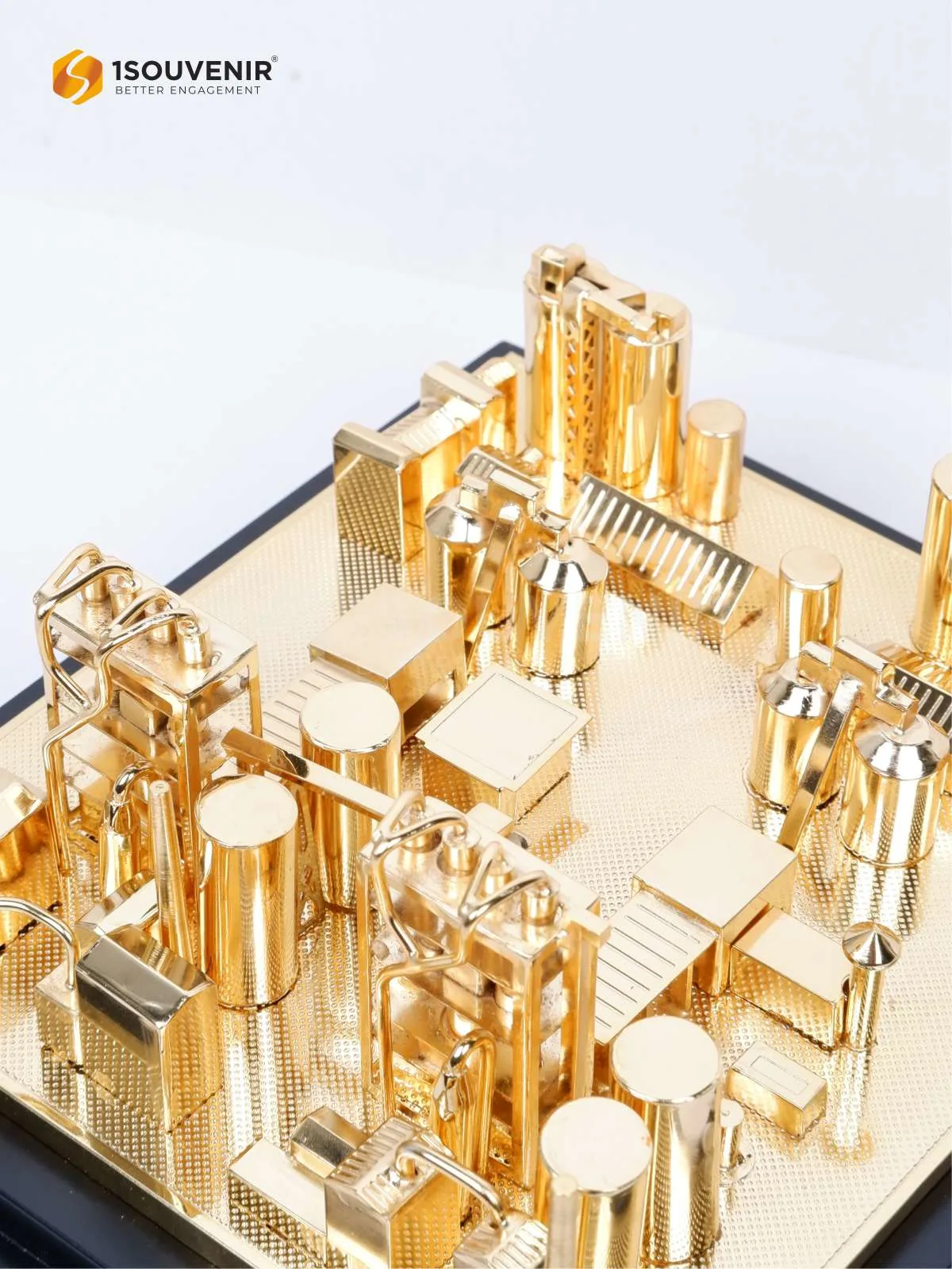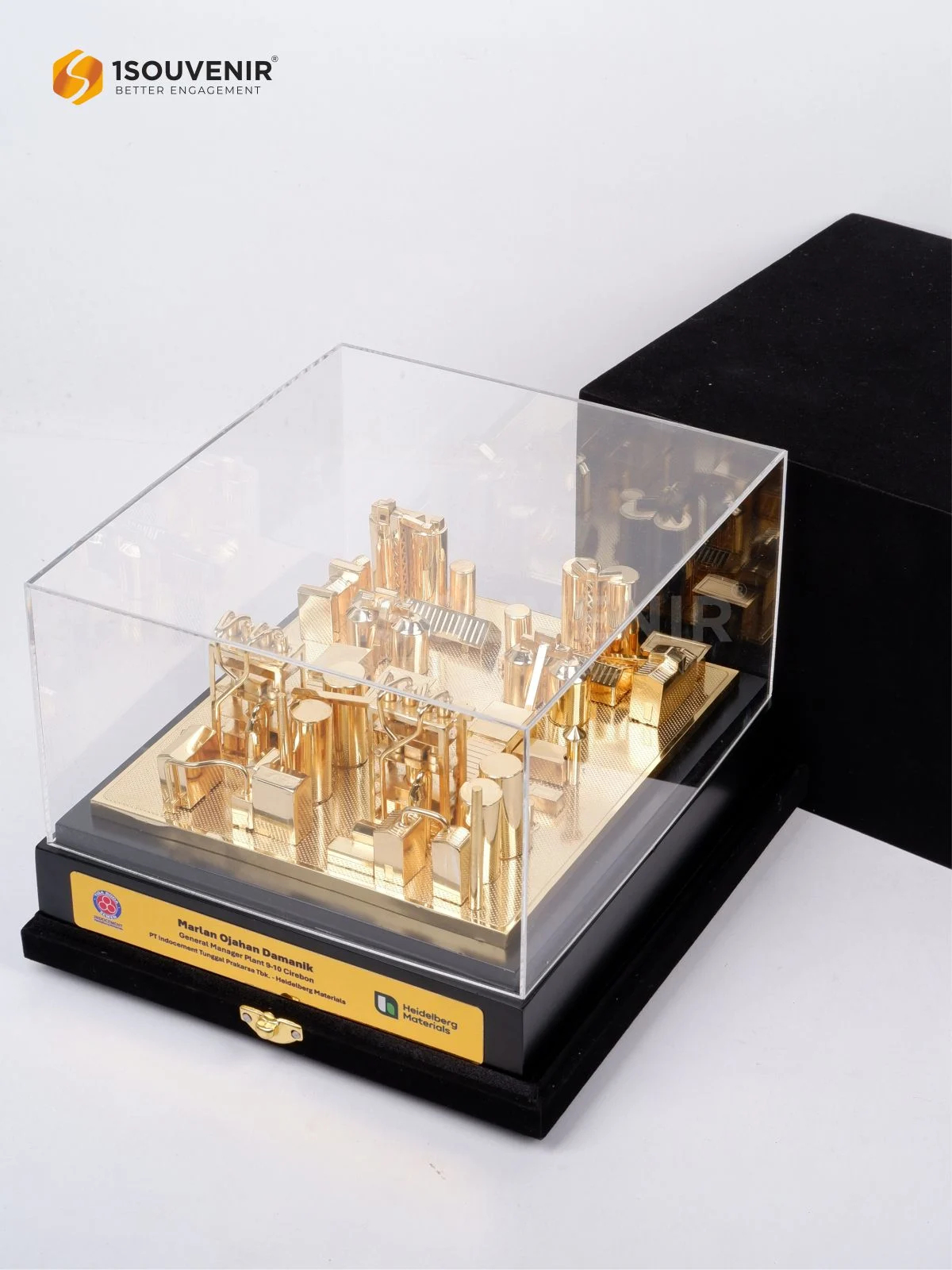 Miniatur Indocement Tunggal Prakarsa ini merepresentasikan kompleks industri secara simbolis, menampilkan detail instalasi dengan sentuhan warna emas yang elegan. Sebuah kenang-kenangan yang merekam perjalanan, pencapaian, dan kebanggaan perusahaan dalam wujud visual berkelas.