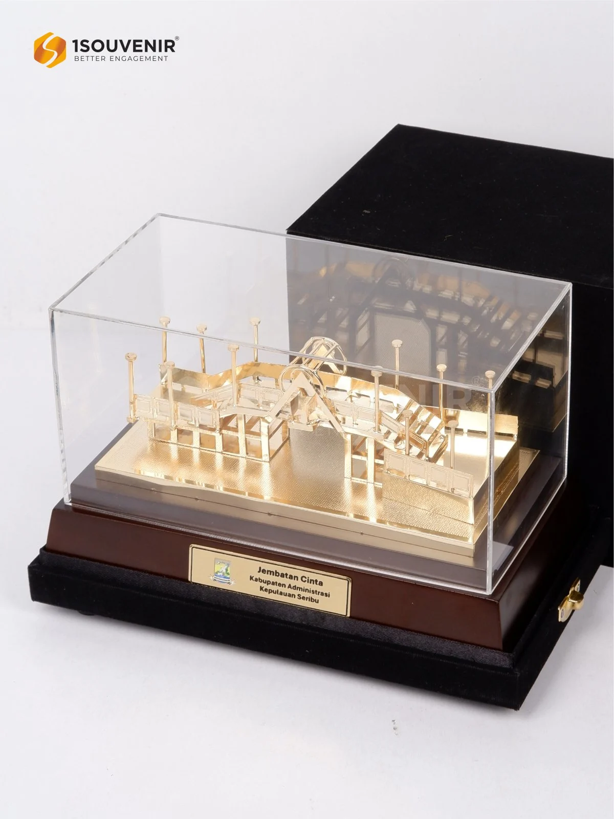 Miniatur Jembatan Cinta Kota Administrasi Kepulauan Seribu menghadirkan representasi detail dari ikon tersebut dalam bentuk elegan. Desainnya menggambarkan struktur jembatan dengan sentuhan artistik, menjadikannya kenang-kenangan yang mengabadikan keindahan dan makna dari destinasi istimewa ini.