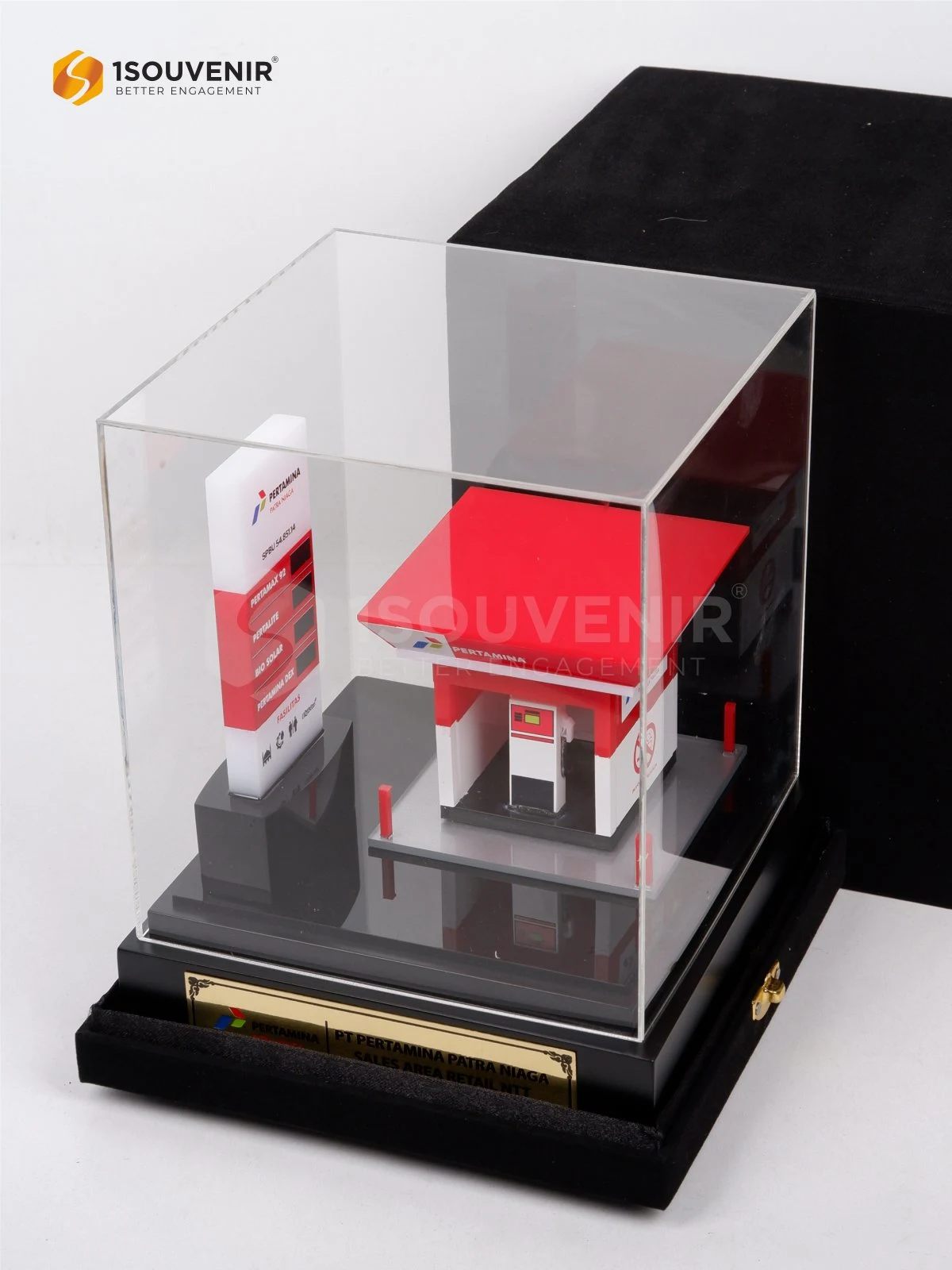 Desain miniatur ini dibuat dengan menonjolkan elemen SPBU yang memiliki tampilan presisi dan disempurnakan dengan sentuhan elegan. Ditambah lagi, miniatur ini memadukan warna khas serta struktur yang rapi. Hal ini menjadikan miniatur memancarkan kesan profesional sebagai cendera mata instansi yang berkelas.