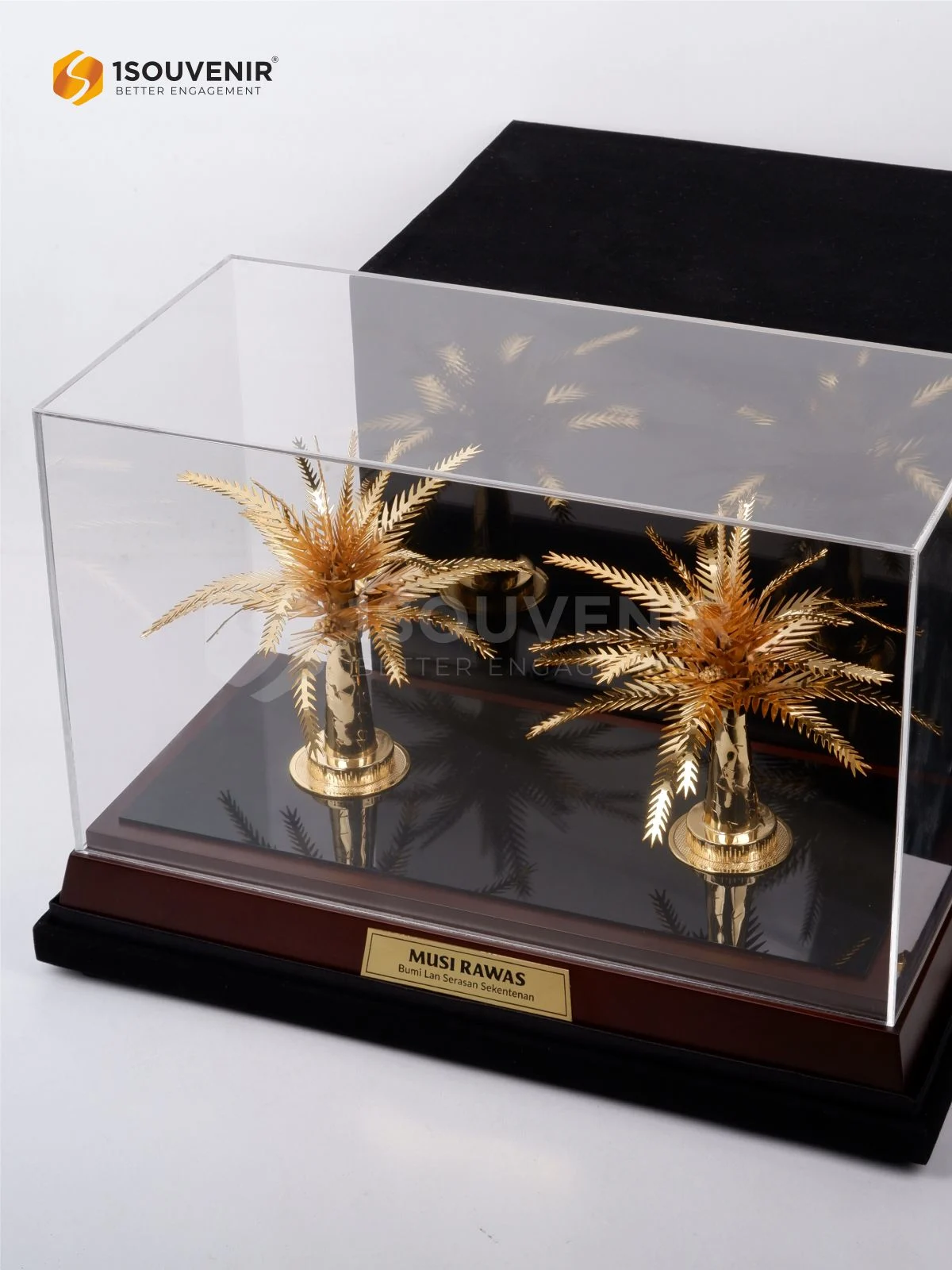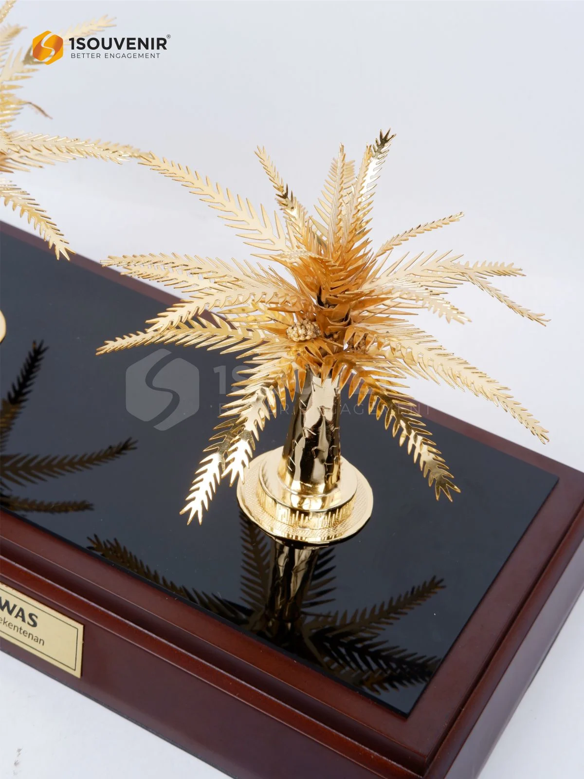 Desain miniatur dibuat dengan detail menyerupai pohon sawit yang menjulang, dilengkapi sentuhan warna emas yang elegan. Setiap elemen dirancang presisi sehingga menghadirkan tampilan yang menarik dan berkelas.